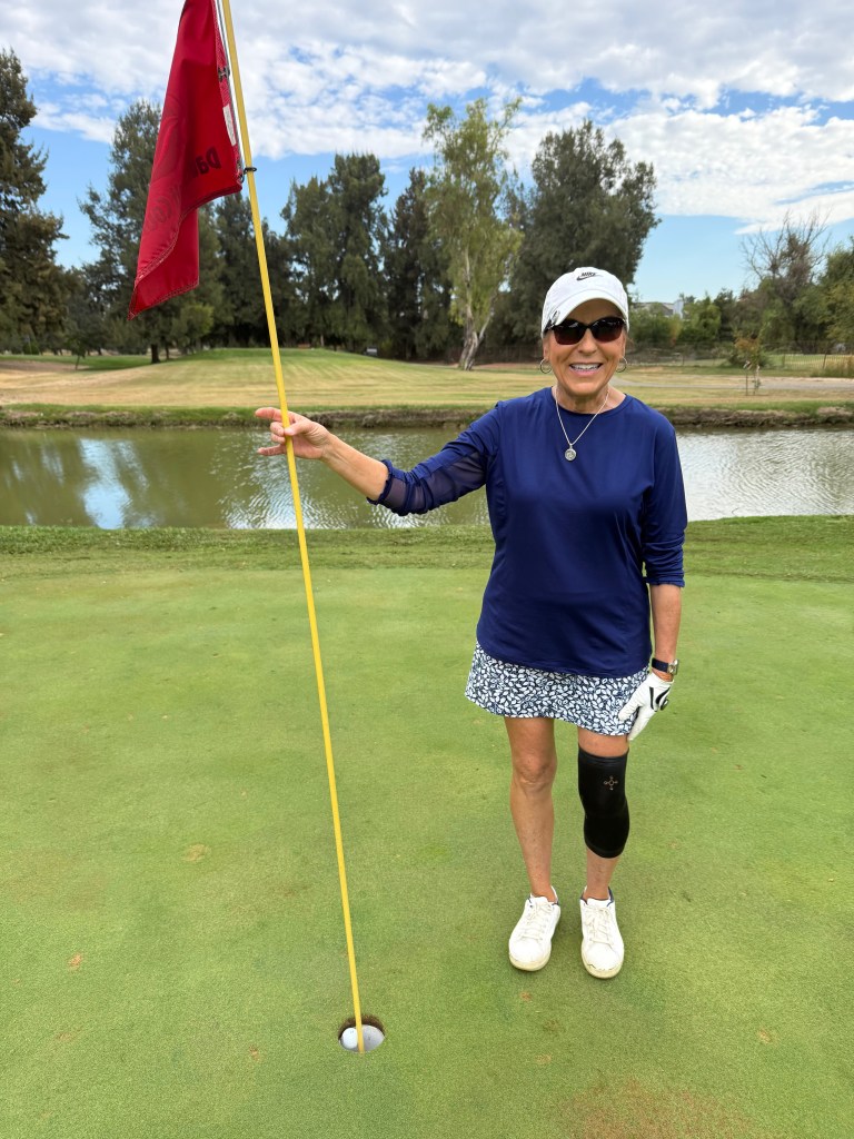 Lynette tees up on #7, launches her ball, hits the water, skipped up onto the green, and lands in the hole? We’re not sure, they could still see the ball. Upon further investigation the ball was trapped between the edge of the hole and the pin! NOW the cheering can begin!!Congratulations Lynette!